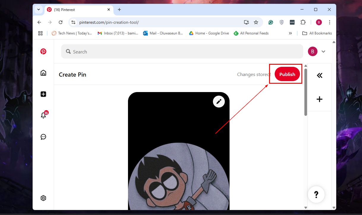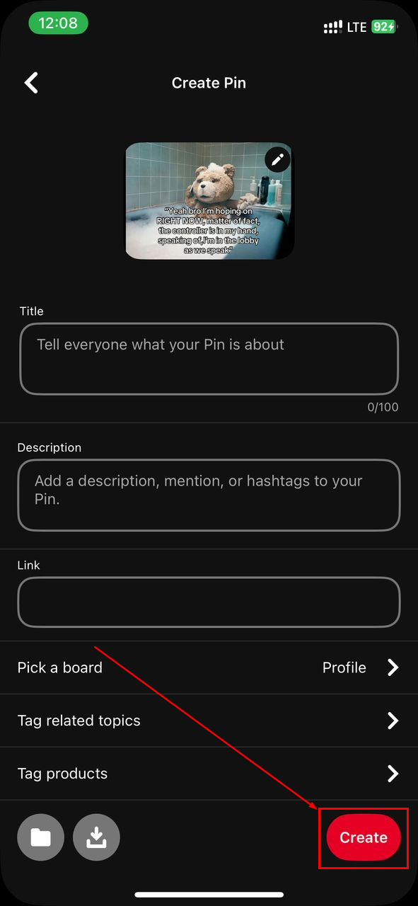 Step 4: Now, give the post a title, description, link, board, tags, etc, and finally click the Create button at the bottom right corner