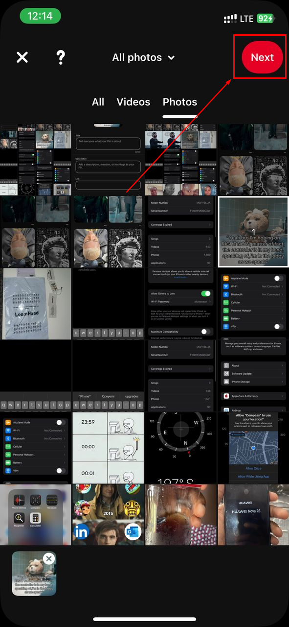 Step 3: Select the picture or video you wish to post, then tap "Next" at the top right corner