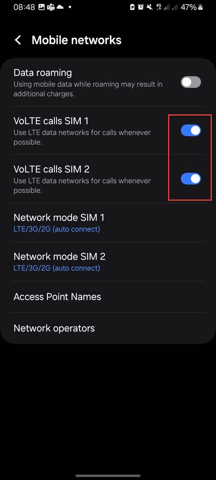 Step 3. Turn on "VoLTE" for the SIM you want (you’ll see something like “VoLTE calls SIM 1/SIM 2” depending on your device)