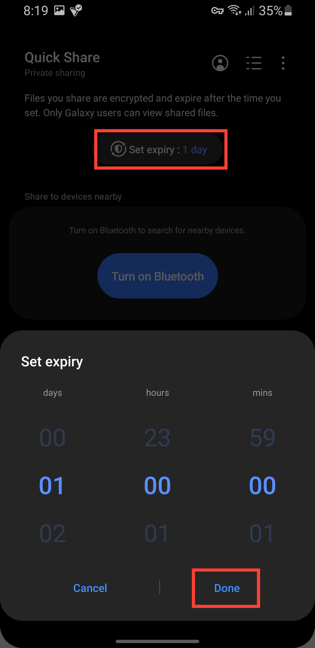 Step 4: Select the expiration time for the file shared. You can modify the time by tapping on "Set expiry," then select the expiry time of your choice, and click Done
