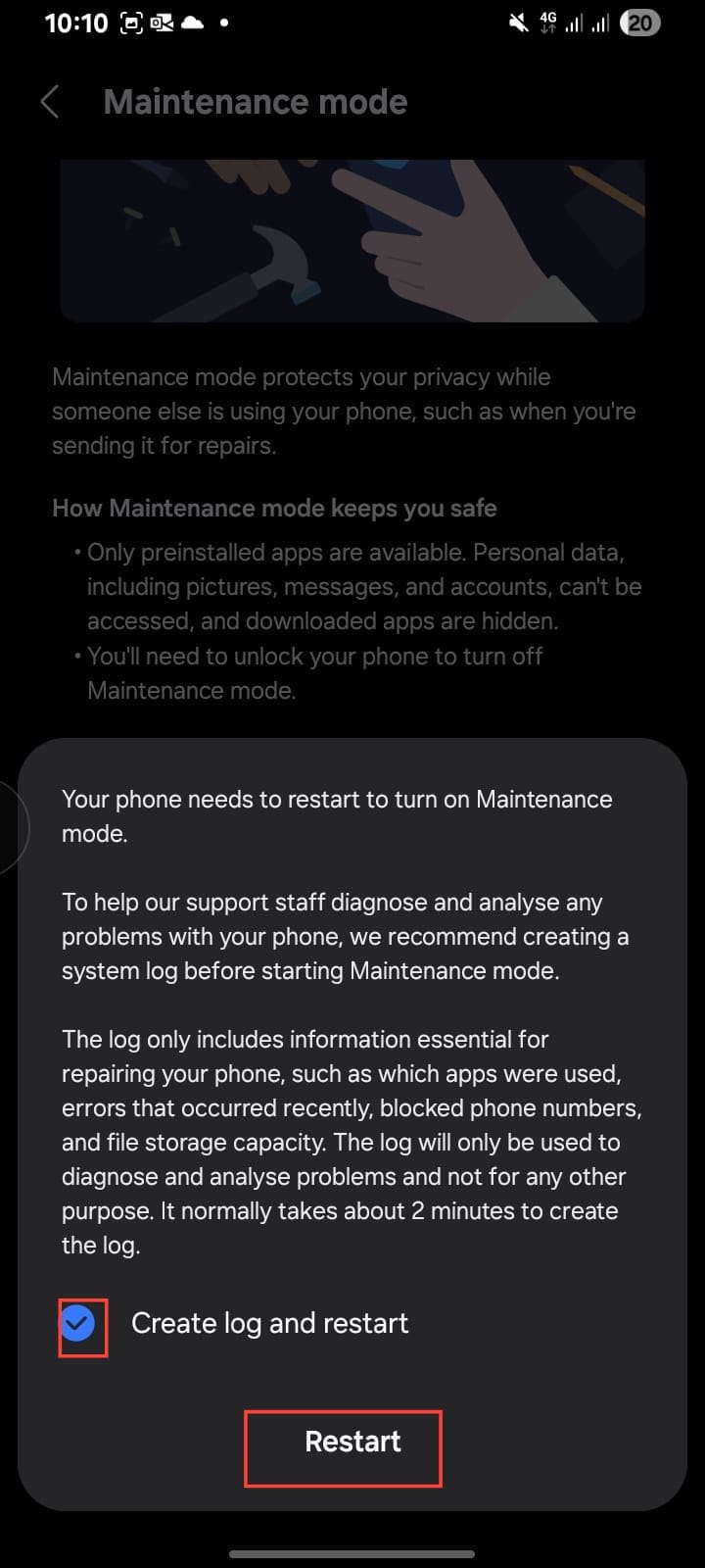 Step 4. Your phone will ask to restart (you can choose to create a log if you want), tap Restart, and enter your password to confirm.