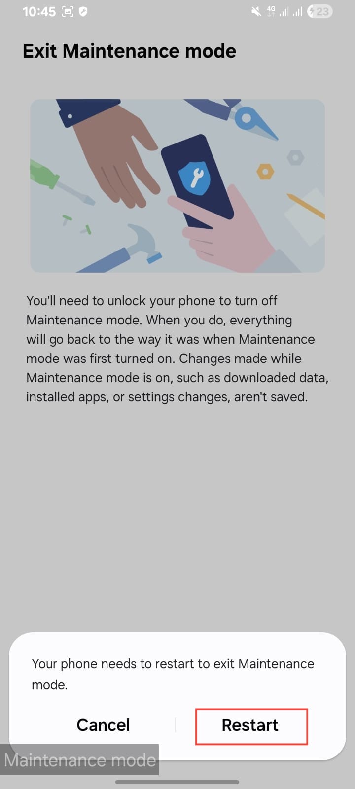 Step 2. Tap the banner that says, "Your phone is in Maintenance mode."