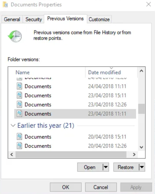 - Step 3: Head to “Previous Versions” tab. Pick an older version of erased file. Hit “Restore.”