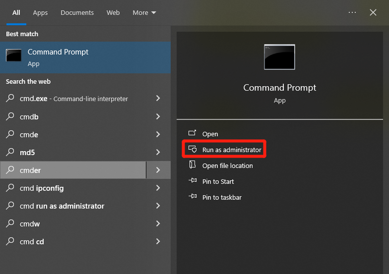 Step 2: Write “CMD.” Then, launch “Command Prompt” with administrator privileges.