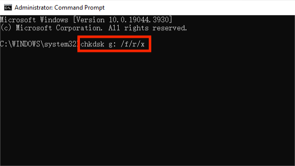 Step 3: Write “chkdsk g: /f /r /x.” Press “Enter.” Replace “g” with the letter of your external hard drive.