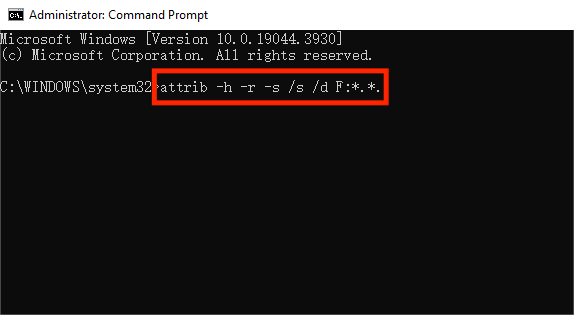 Step 3: Write “attrib -h -r -s /s /d F:*.*.” Press “Enter.” (Here change “F” to your external drive’s letter). This command will try to recover data from a formatted hard drive.