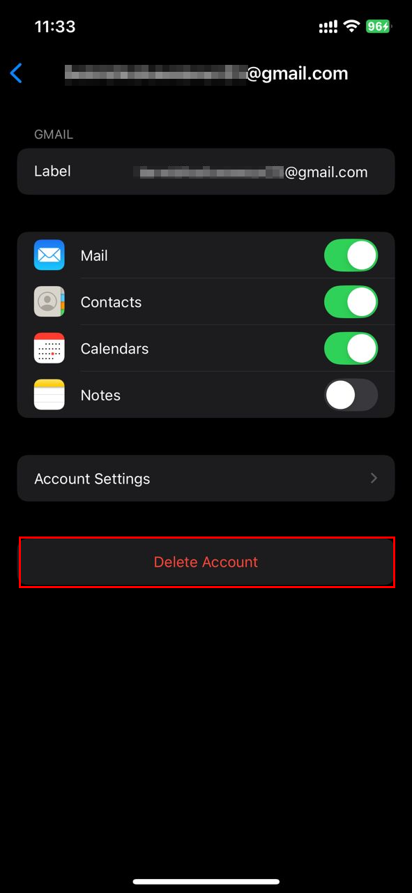 Step 5: Tap "Delete Account" at the bottom. This removes emails, contacts, calendars, and notes associated with that account from your phone