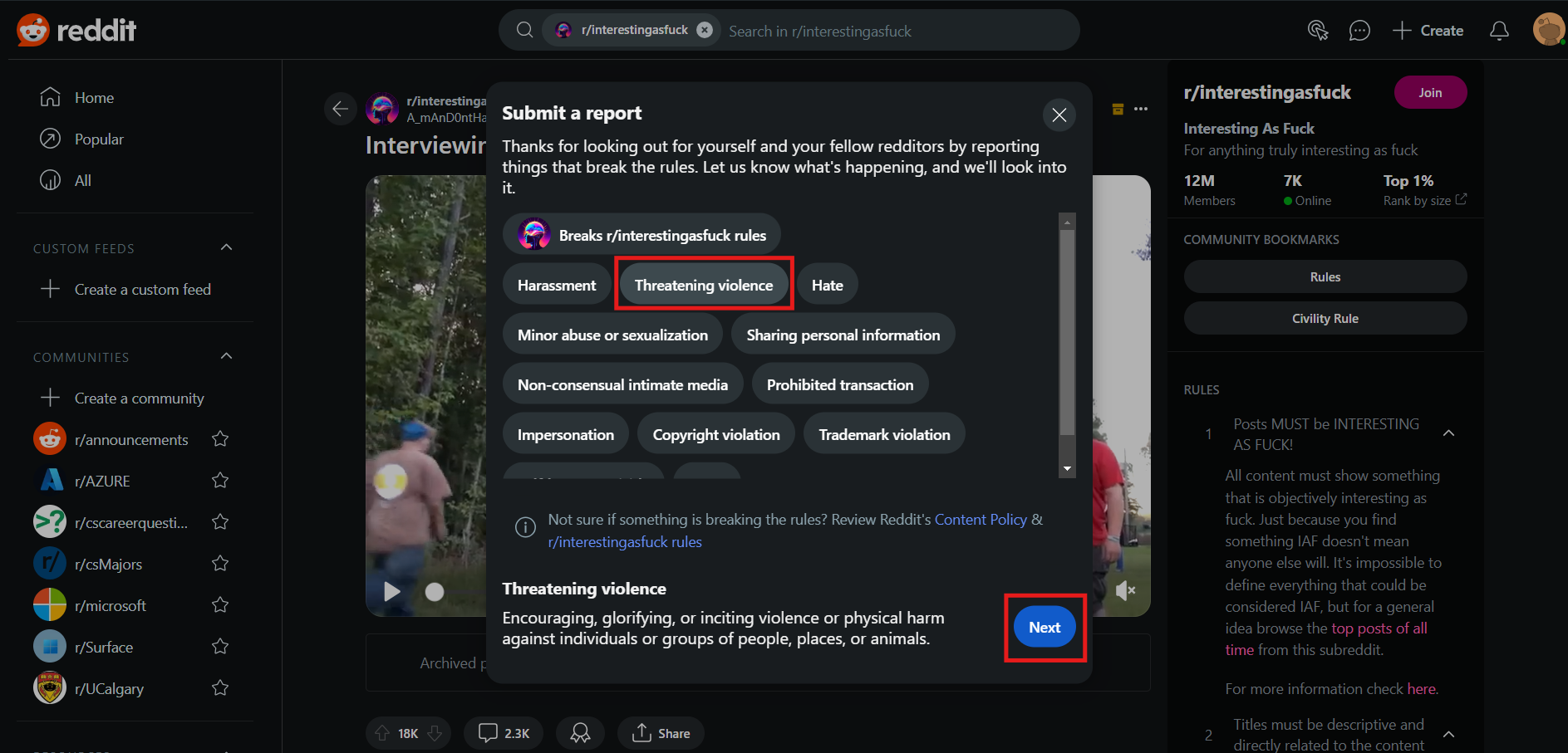 Step 4: You will be presented with a list of reasons for reporting the content. Choose the one that best describes why you are reporting the post or comment (in this example, we chose threatening violence) and click on "Next."