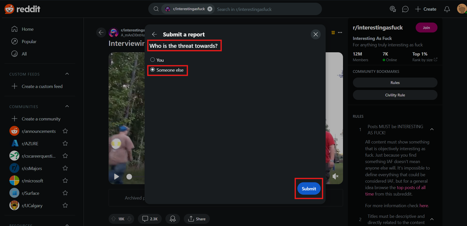 Step 5: After selecting the reason, you may be asked to provide additional details. In this example, we were asked "Who is the threat towards?" which we ticked someone else. Then click on the "Submit" button.