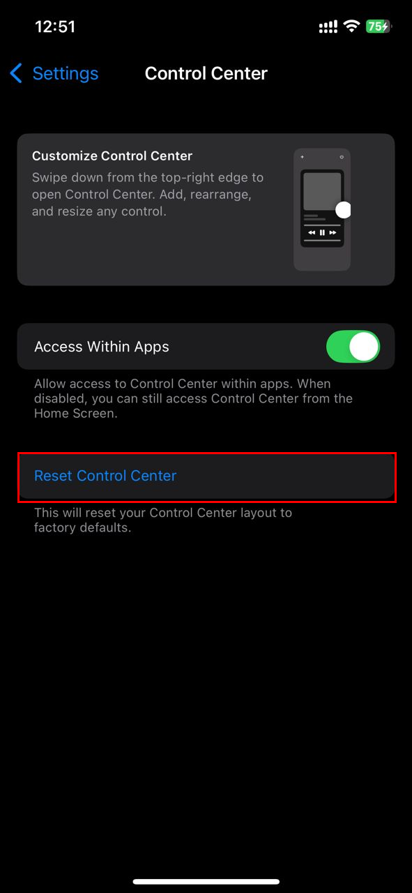 Step 2: Tap “Reset Control Center” and your iPhone's Control Center will be back to its default layout