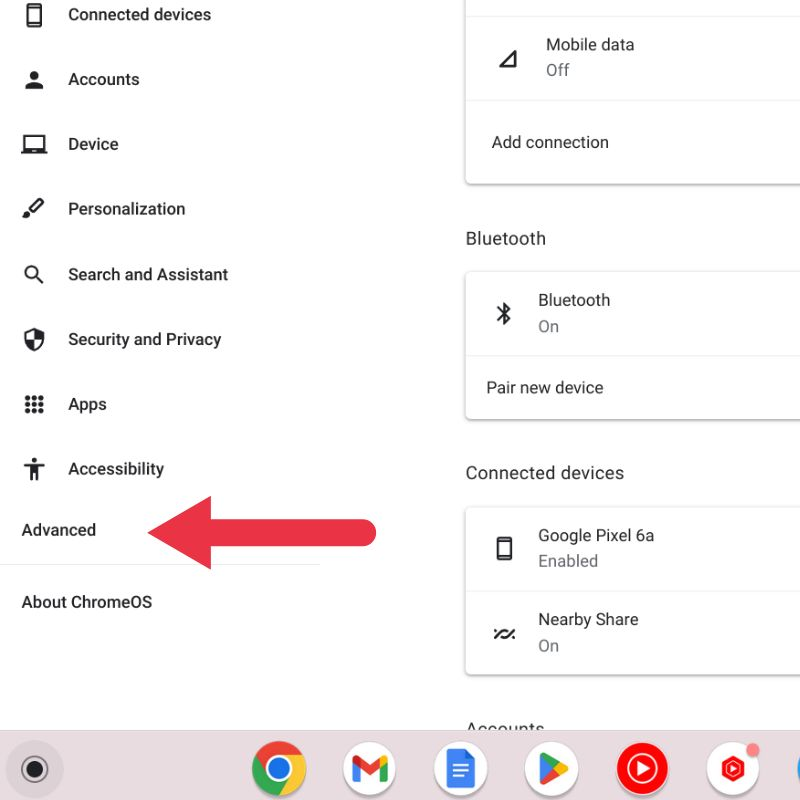 2. After accessing the ChromeOS settings, expand the left pane by clicking on the Advanced option.