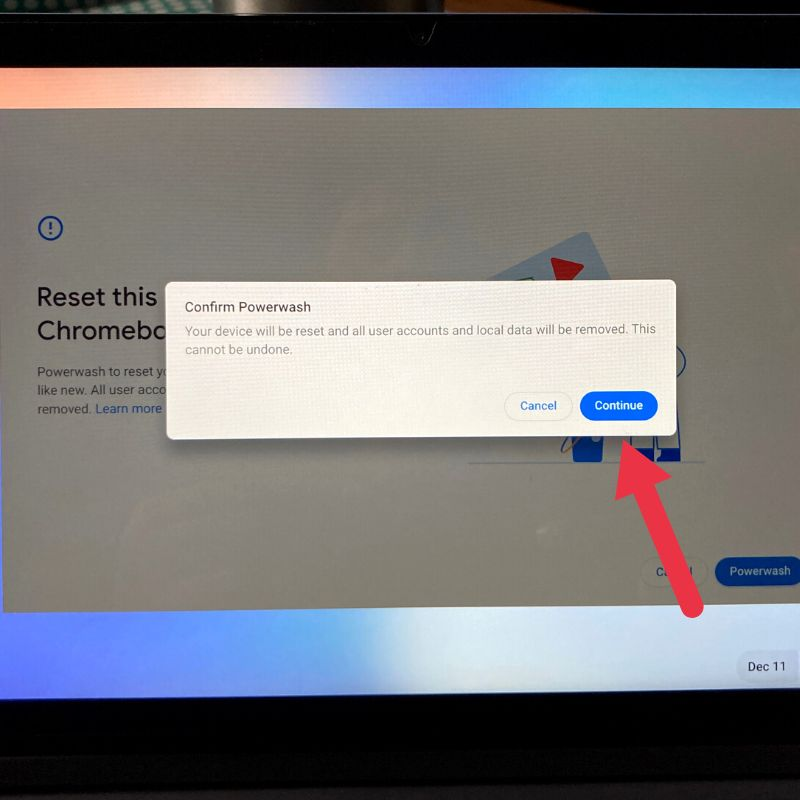 3. On the next screen, click on Continue. This will start the reset process on your Chromebook.