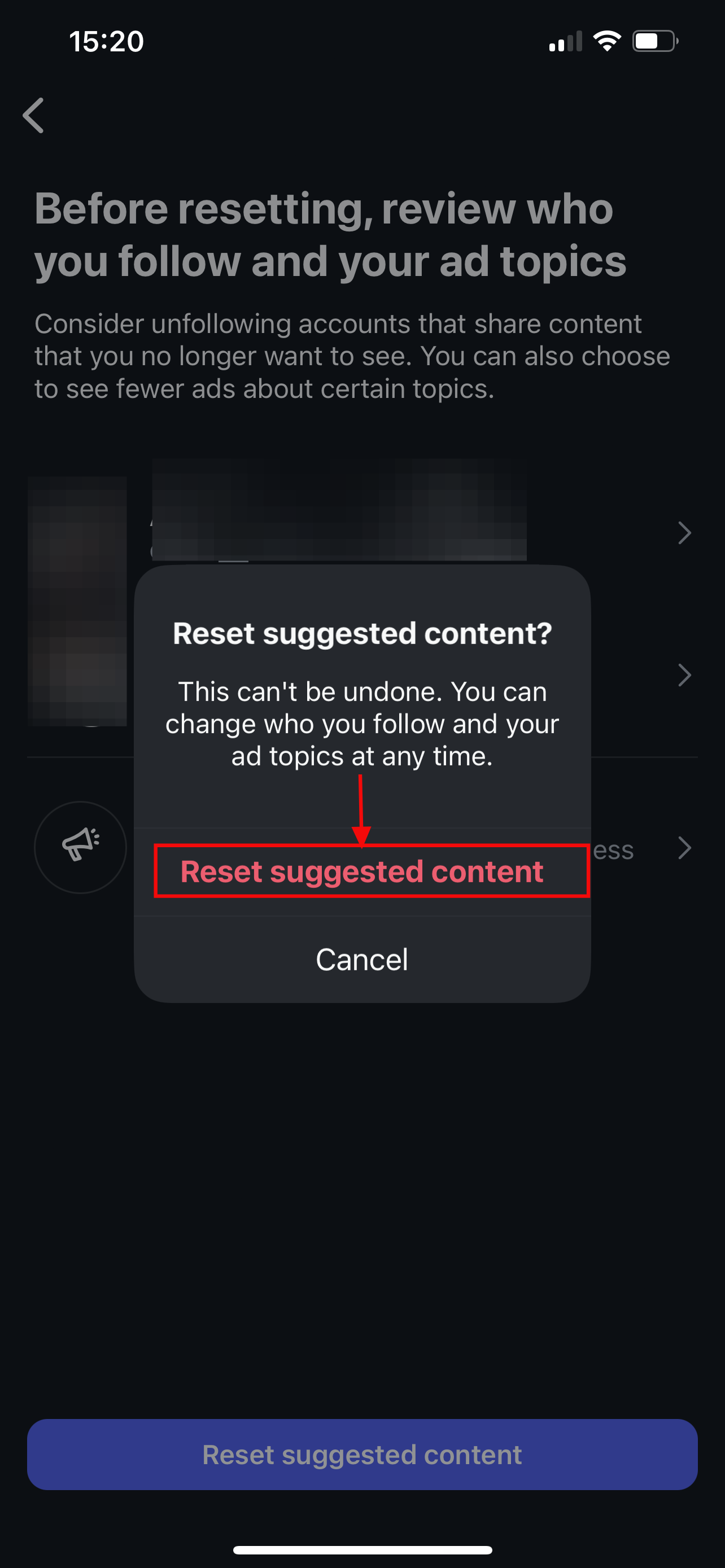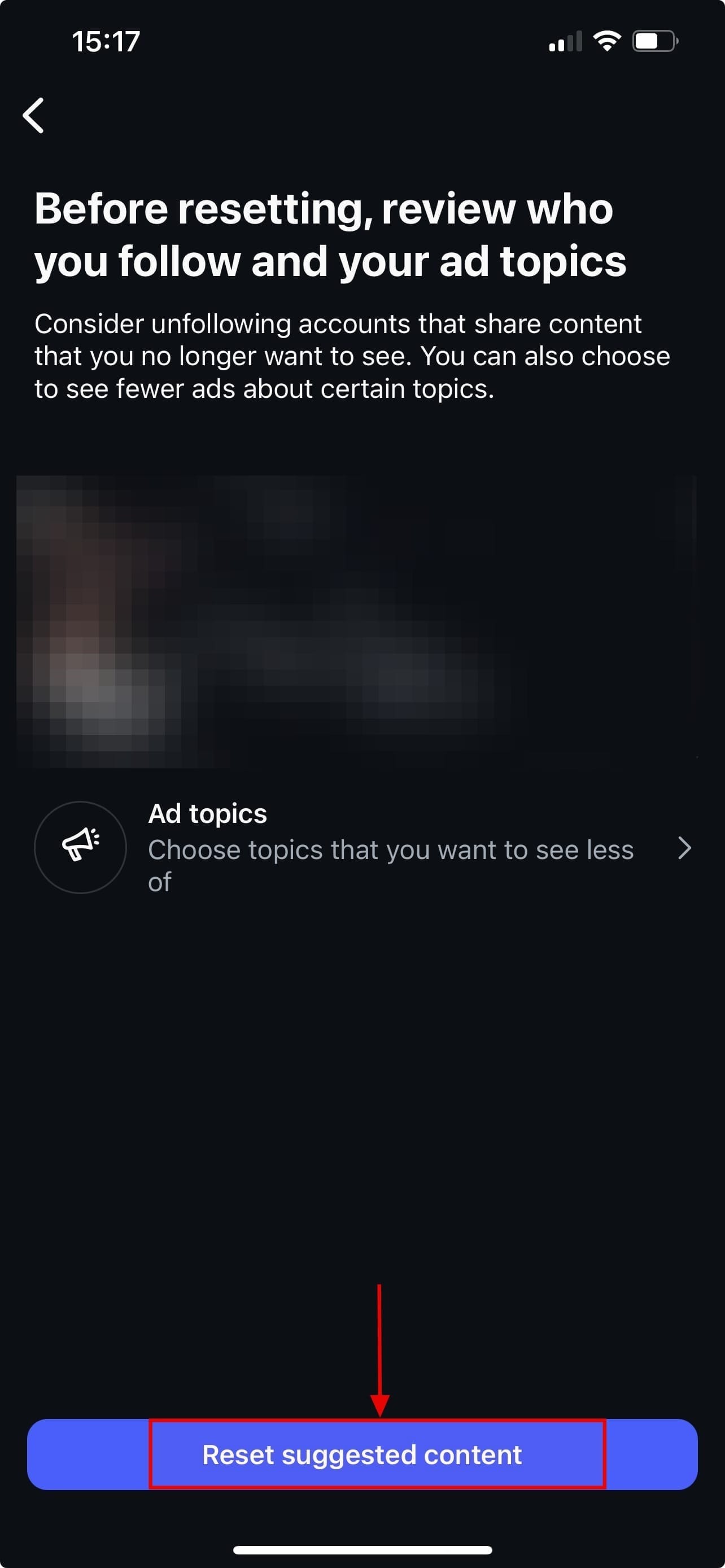 Step 7: Review who you follow and your ad topics before clicking on Reset suggested content