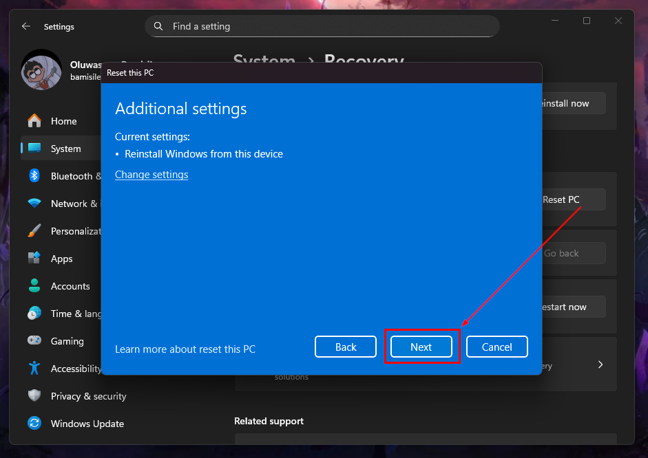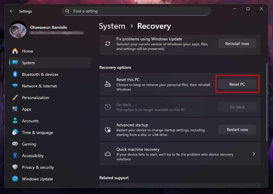 Step 3: Now, click "Reset PC" under the Recovery options section