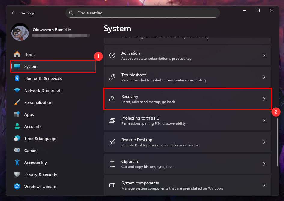 Step 2: Click on "System" among the options on the left pane, then select "Recovery" on the right pane