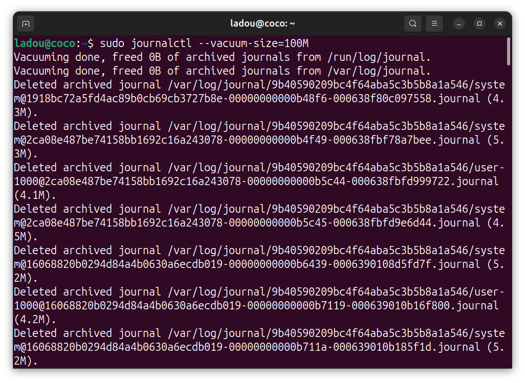 Logs can accumulate quickly, especially on busy systems. The first command reduces system logs to 100MB, while the second deletes archived log files. If you're worried, logs are generally safe to remove.