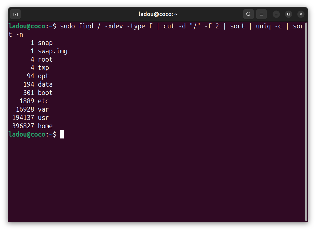 sudo find / -xdev -type f | cut -d "/" -f 2 | sort | uniq -c | sort -n