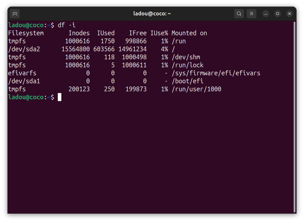 This shows inode usage across all mounted filesystems. If any partition has 100% inode usage, you’ve run out of available inodes, even if there’s still free disk space.