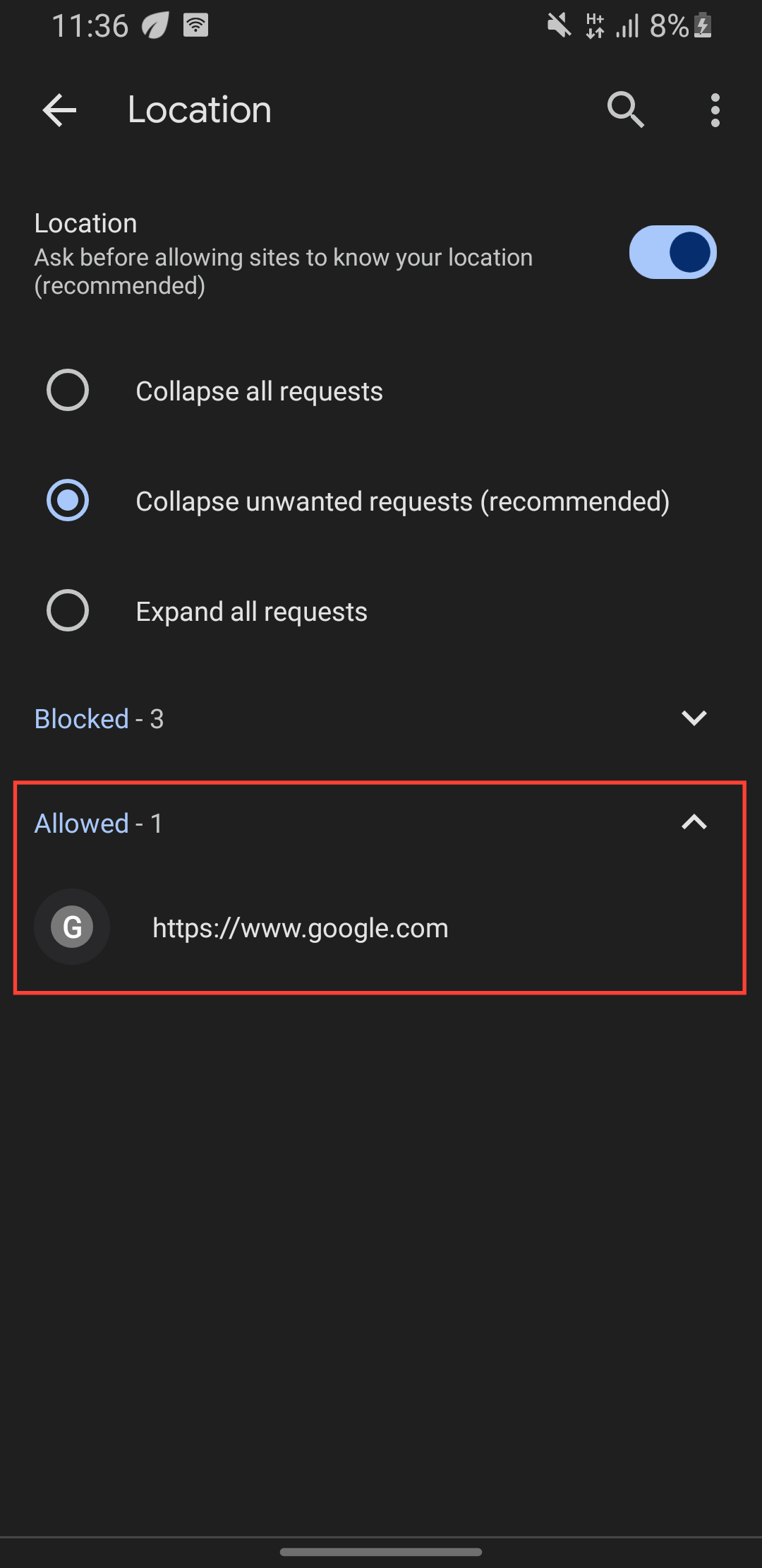 Step 5: To see websites authorized to use that permission, expand "Allowed"