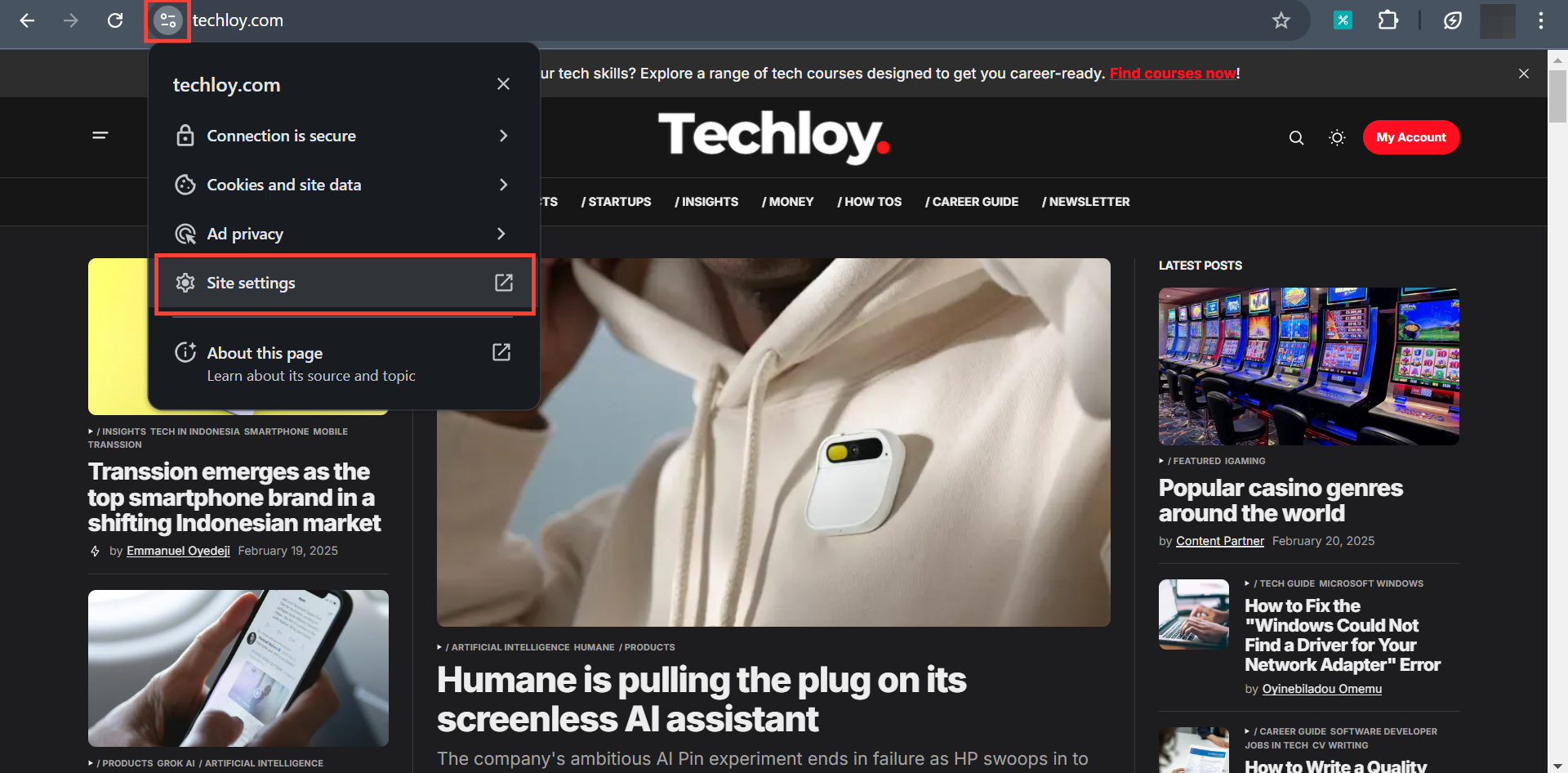 Step 2: To the left of the web address, click the "view site information" icon and click "Site settings"