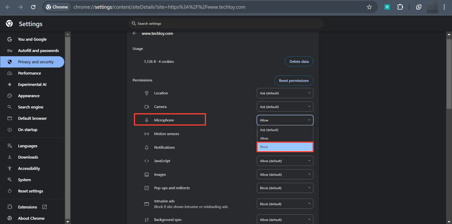 Step 3: This will take you to the permissions for the site. If you've granted permission like "Microphone" open the dropdown next to the permission and select "Block"