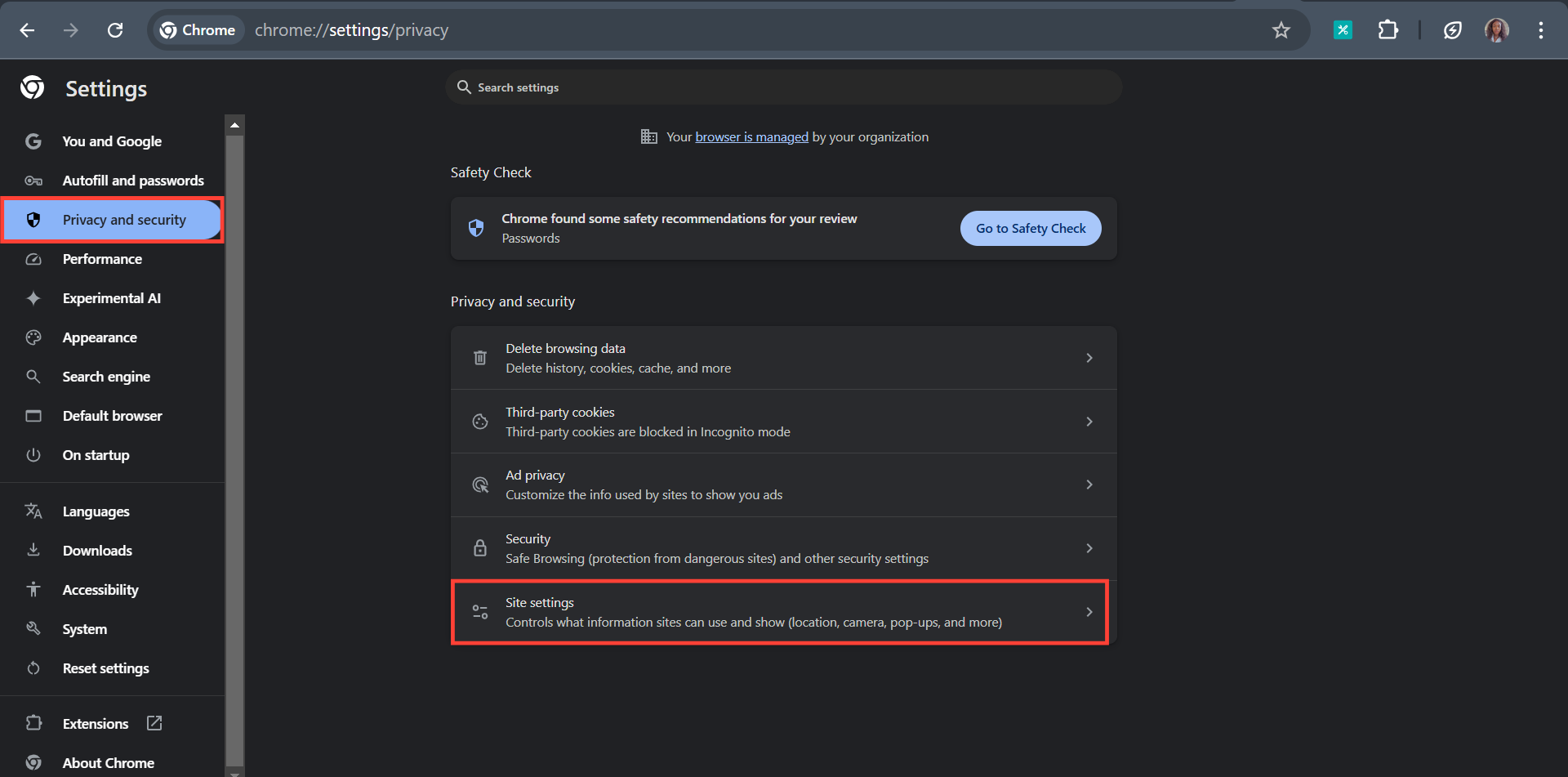 Step 2: Click "Privacy and Security" then select "Site Settings"