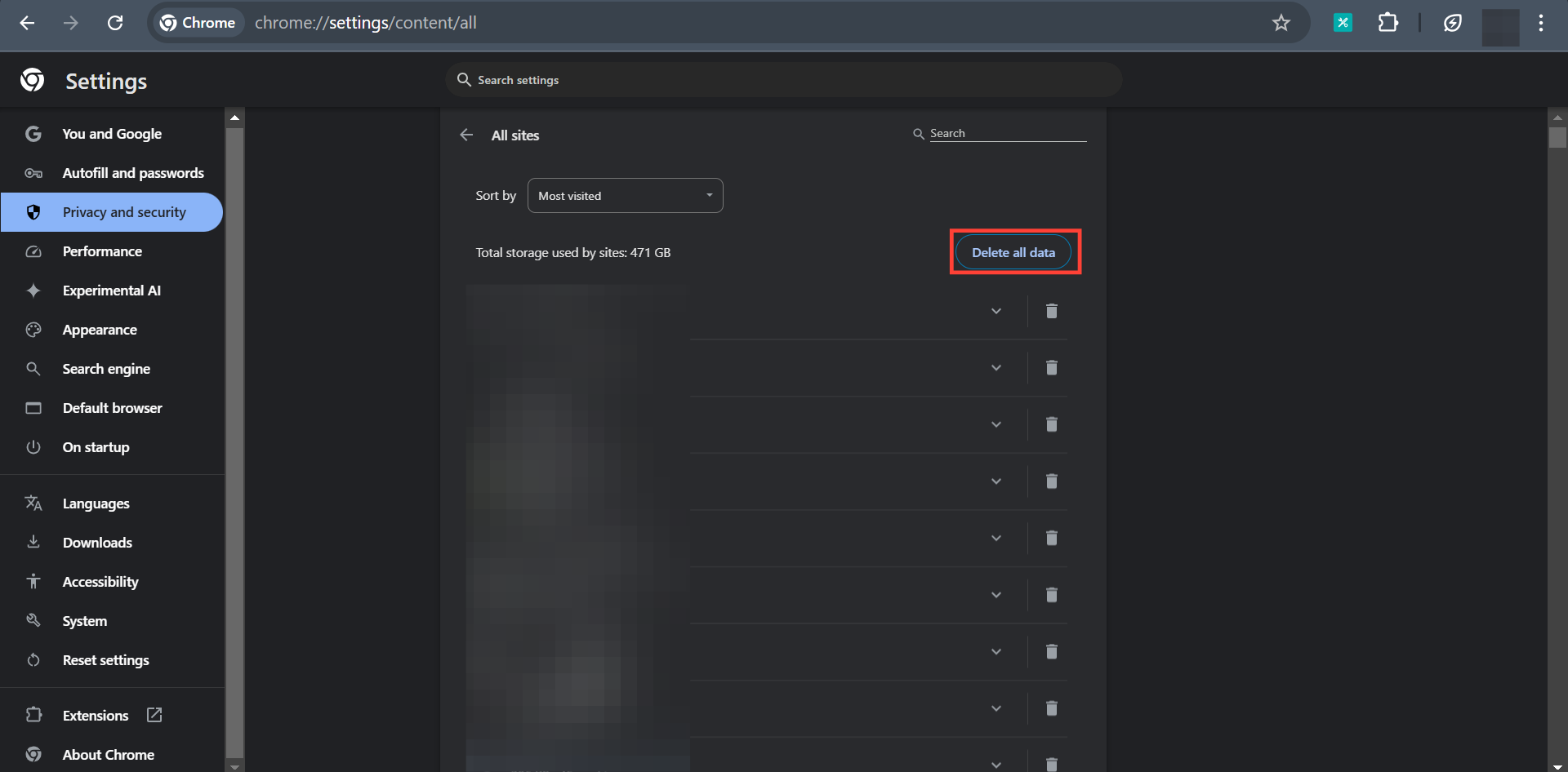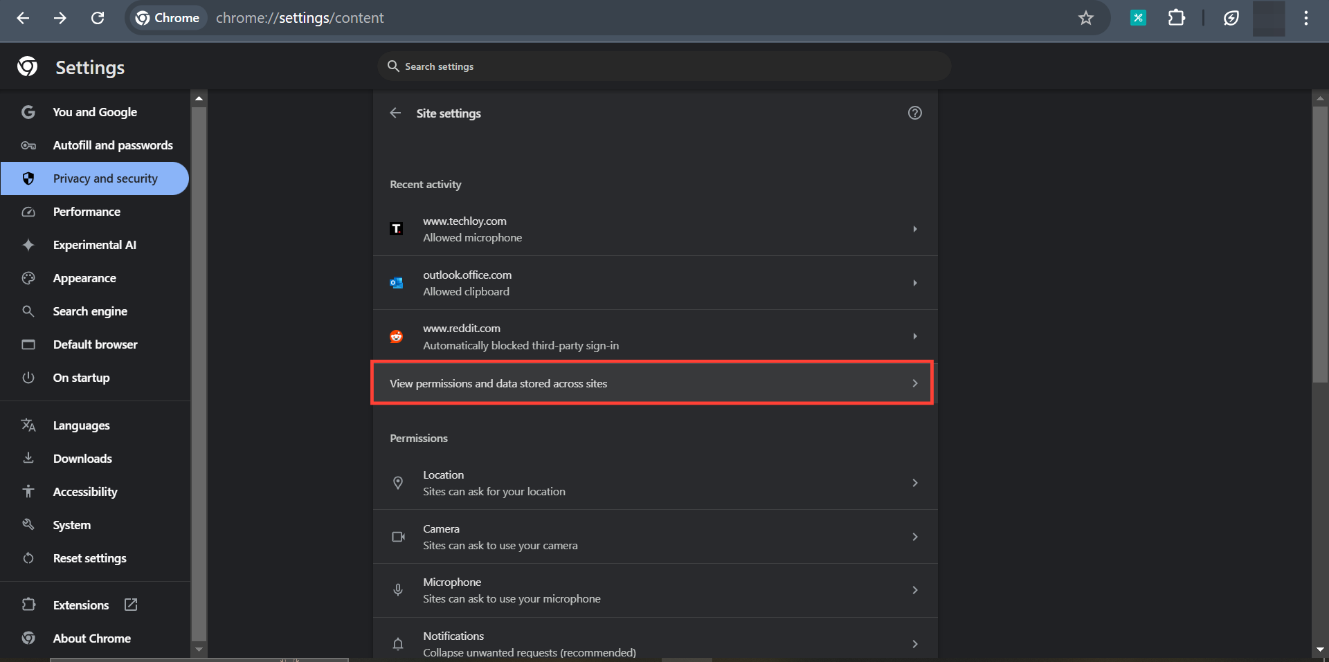 Step 3: To change permissions and data storage on all sites you’ve visited, select "View permissions and data stored across sites"