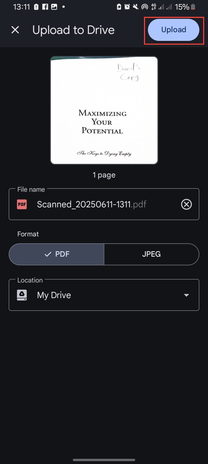 Step 7. Once you are done adjusting to your preference, tap "Done," then "Upload" to save it directly to your Google Drive