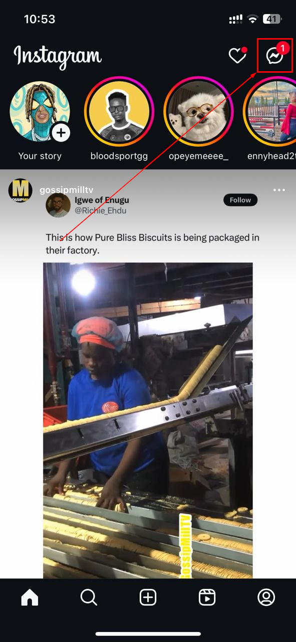 Step 1: Open the Instagram app and select the direct messages icon in the top right corner