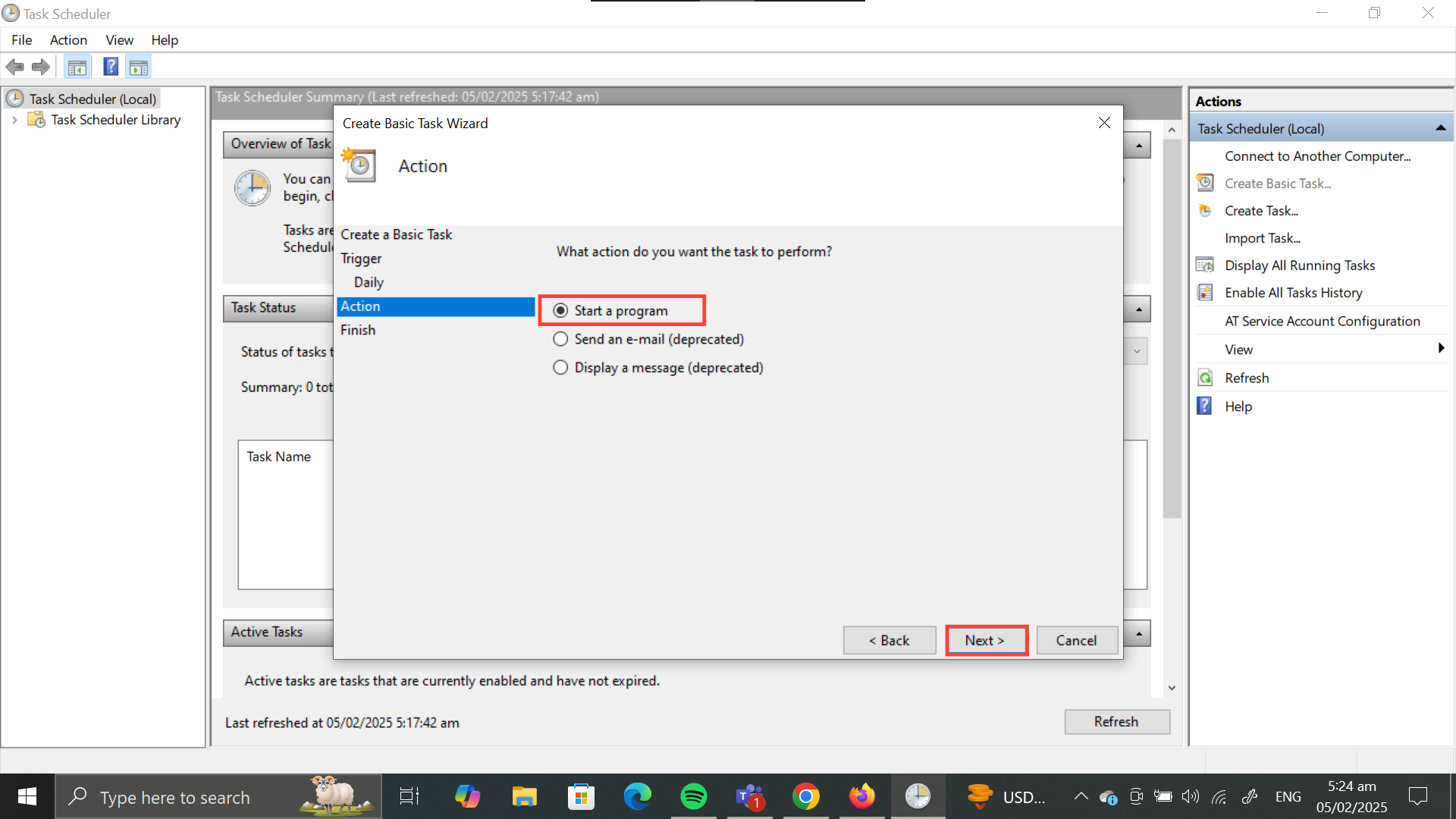 Step 6: Select "Start a program" and click Next.
