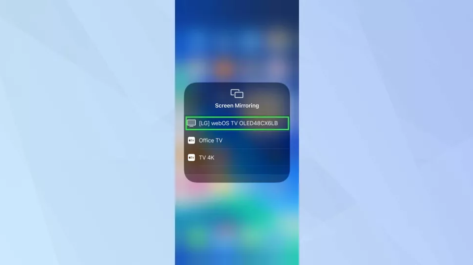 2. Look for your TV model in the list of compatible Screen Mirror devices, which should now be visible on your iPhone. Alternatively, if you have an Apple TV connected to your TV, it's also possible to use it for screen mirroring. Select your TV model and enter the passcode displayed on your TV when prompted to do so on your iOS device.
