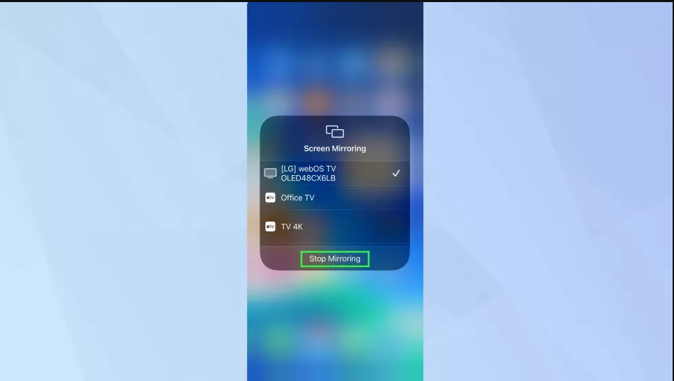 4. To end the screen mirroring, access the Control Center once again, tap on Screen Mirroring, and choose the option to Stop Mirroring.