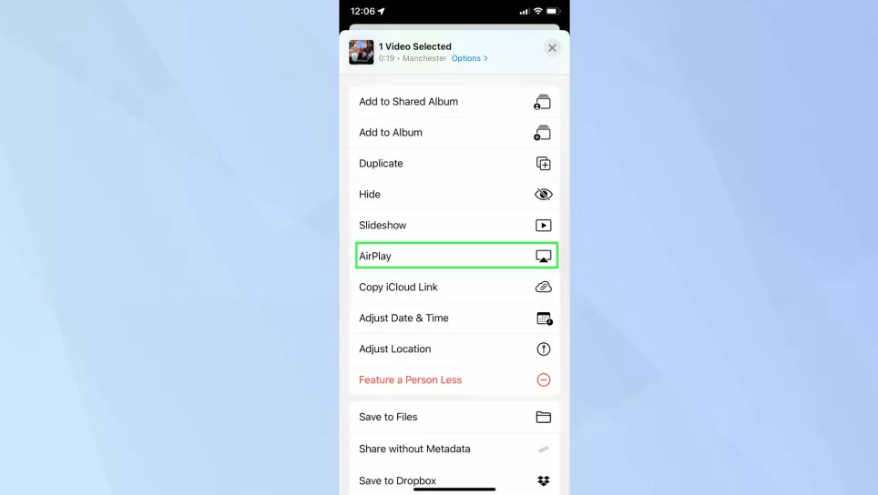 3. In case you are playing a video from the Photos app, tap on the Share button and select the AirPlay icon from the list of options. You will then be prompted to select a device once again.