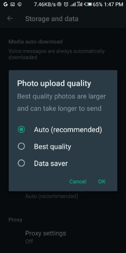 Now, you can choose whether you want to send pictures in their original quality or in a compressed format to save data. There's also an 'Auto' option that's really convenient. So, if you have this setting selected, WhatsApp will automatically send high-quality images when your device is connected to Wi-Fi.
