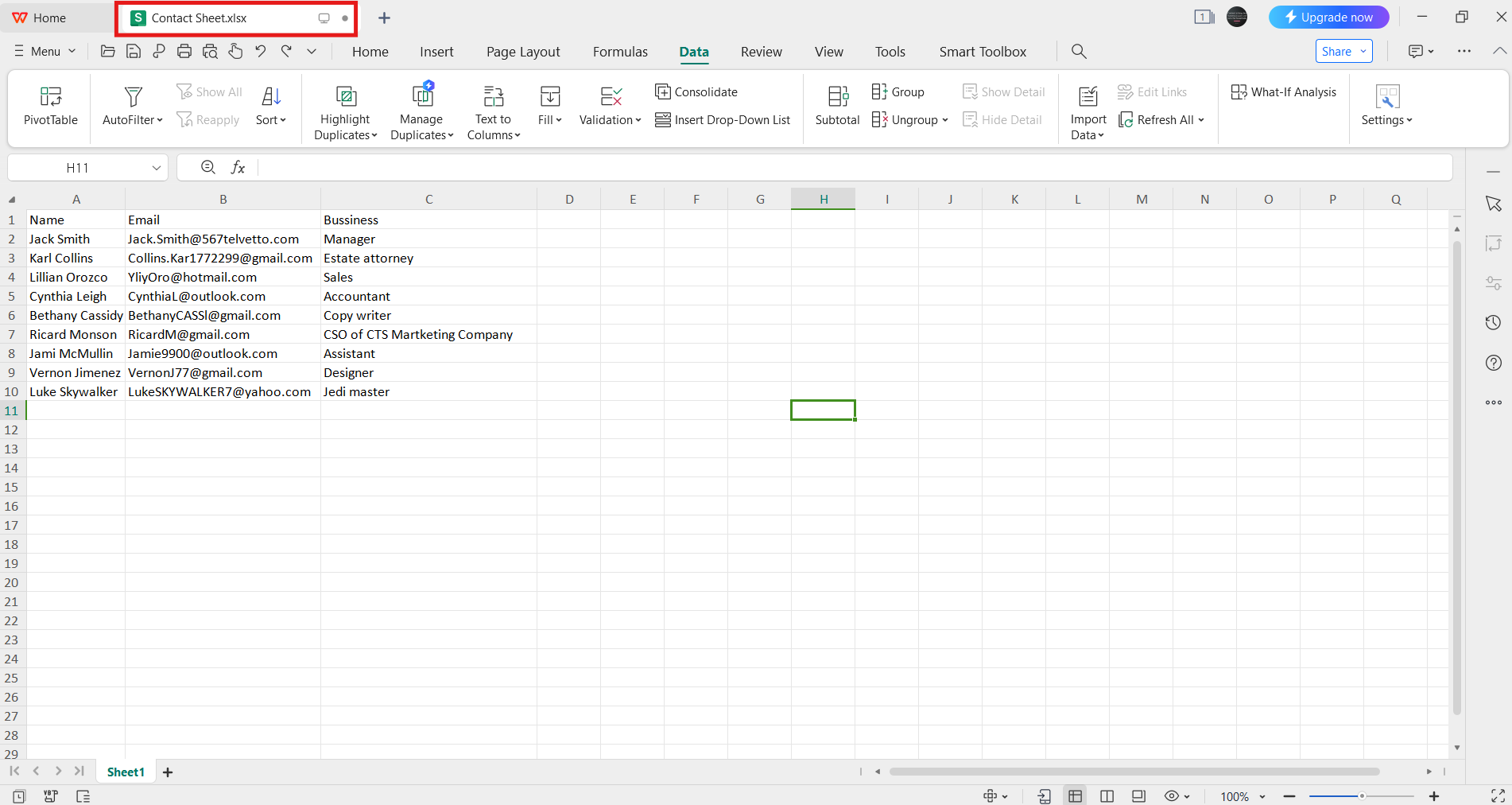 The names, email addresses, and businesses provided in the image above are entirely fictional and do not belong to any individual or entity.