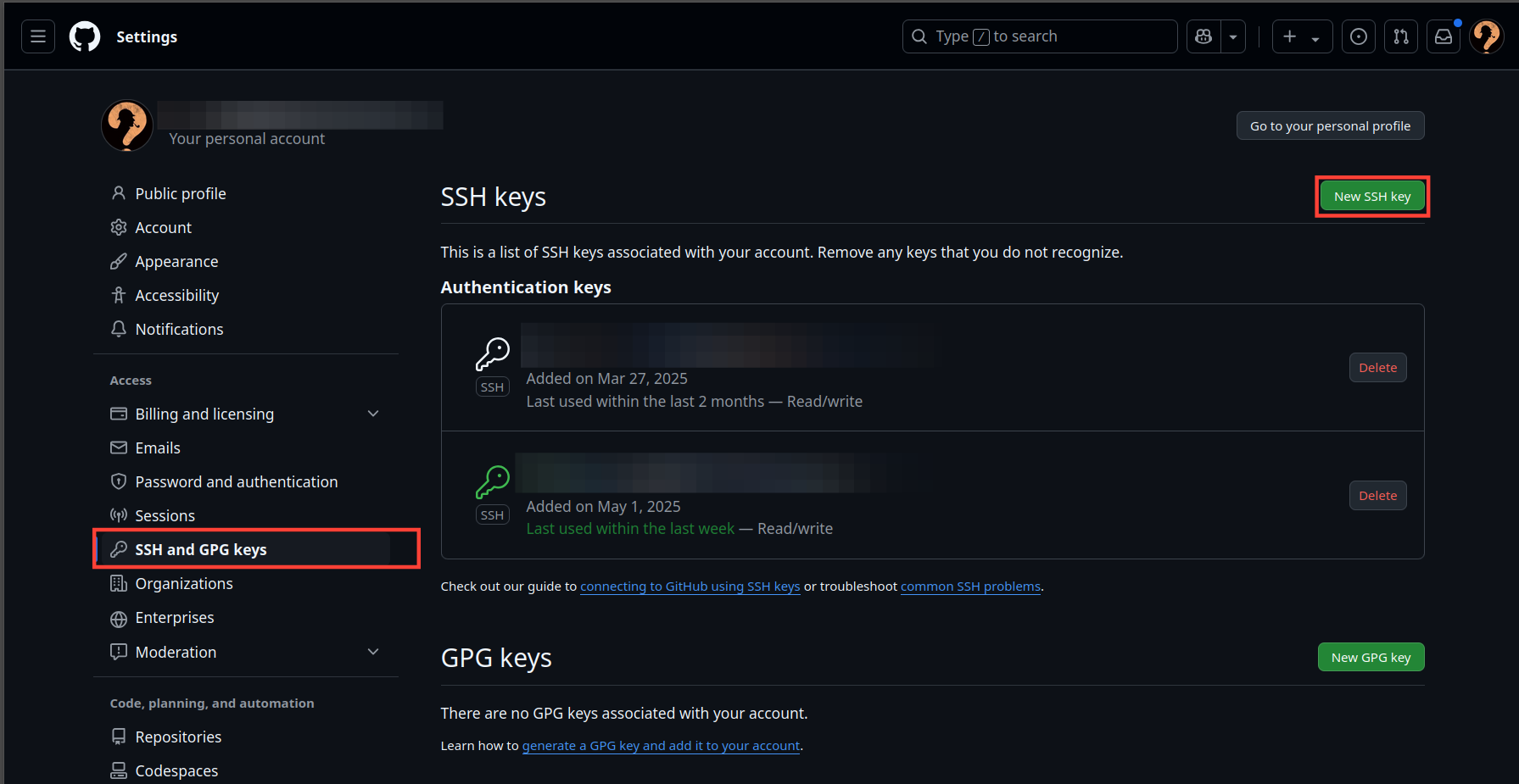 - Go to your GitHub Settings and click on SSH and GPG Keys on the left panel.