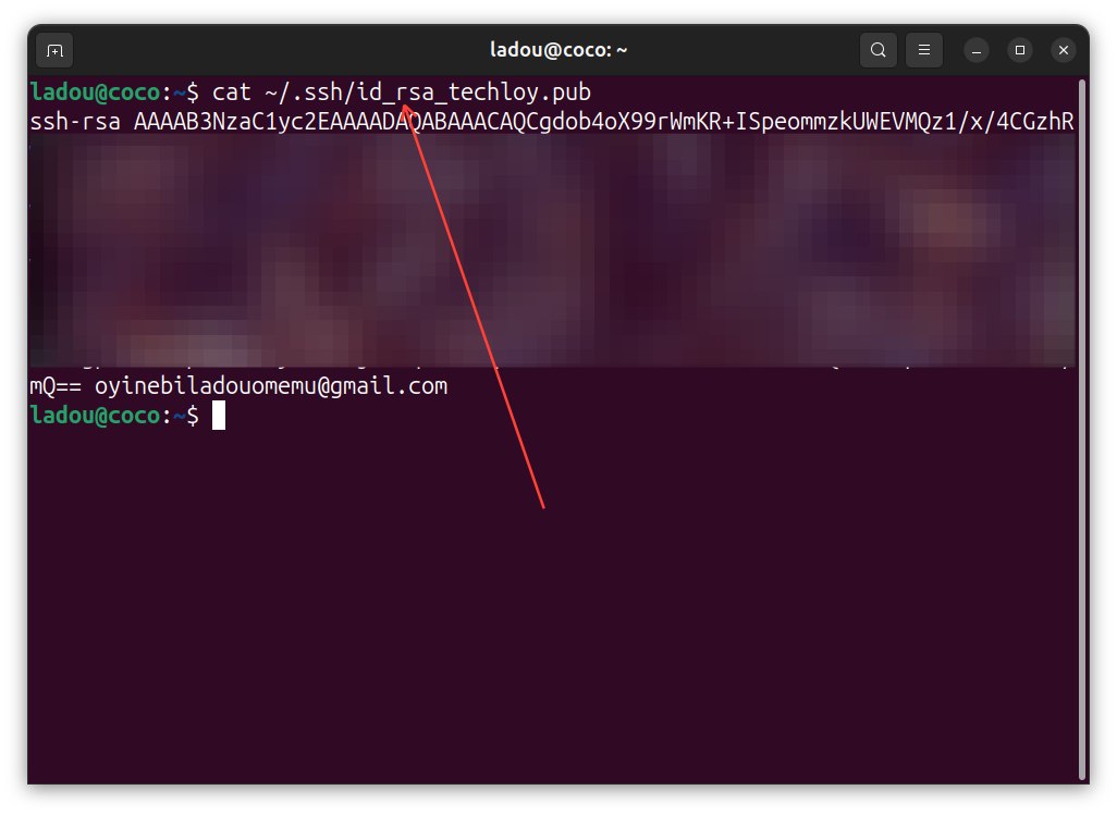Select and copy the entire output (starts with ssh and ends with your email). If you set up your key to use a custom name like I did, don't forget to add the ".pub" to the end of the name. The ".pub" tells it to return the public key, which GitHub needs.