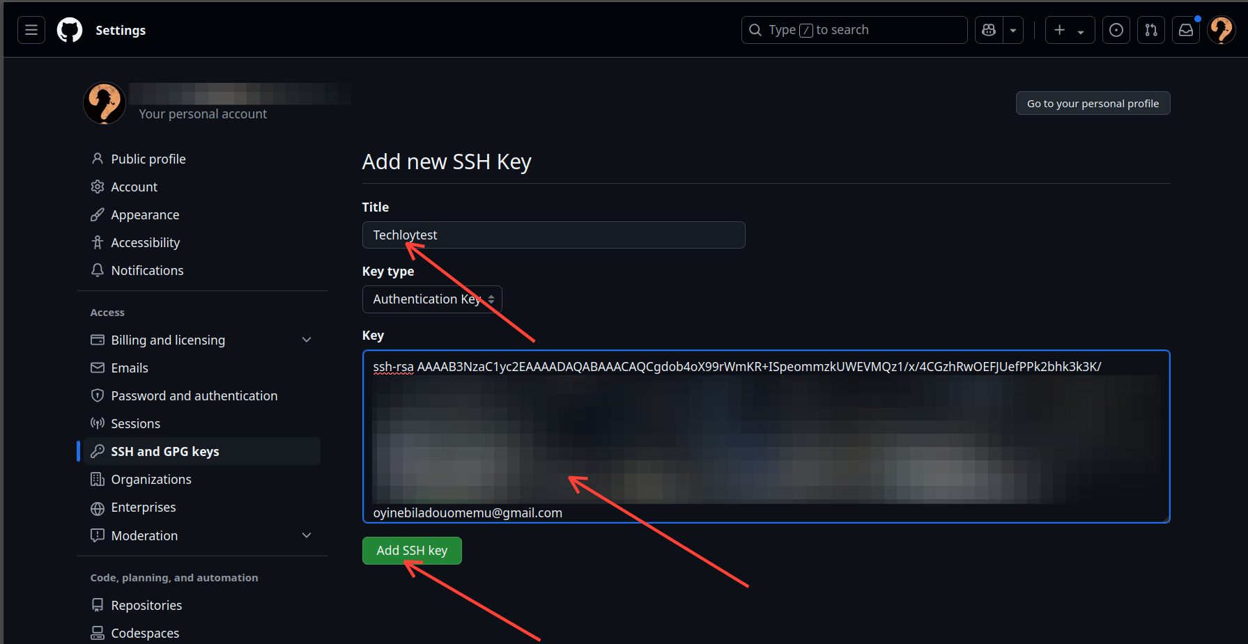 - Give it a title and paste your public key. Then click "Add SSH Key".