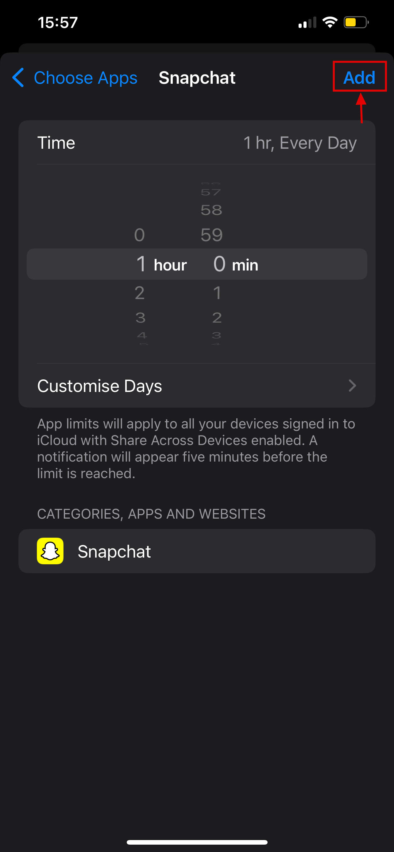 Step 8: Use the picker wheels to set the total amount of time you want to allow for them per day, then finally click on Add