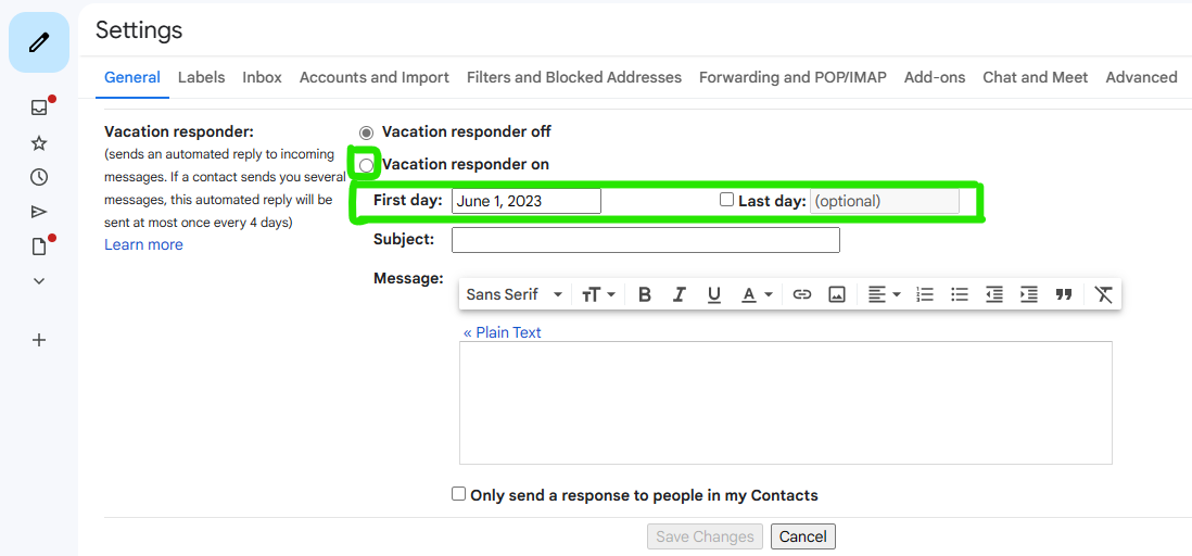 7. Enter the subject and compose the message that you would like to be sent as your out-of-office reply. Afterwards, simply click on Save Changes, and your out-of-office email reply will be activated.