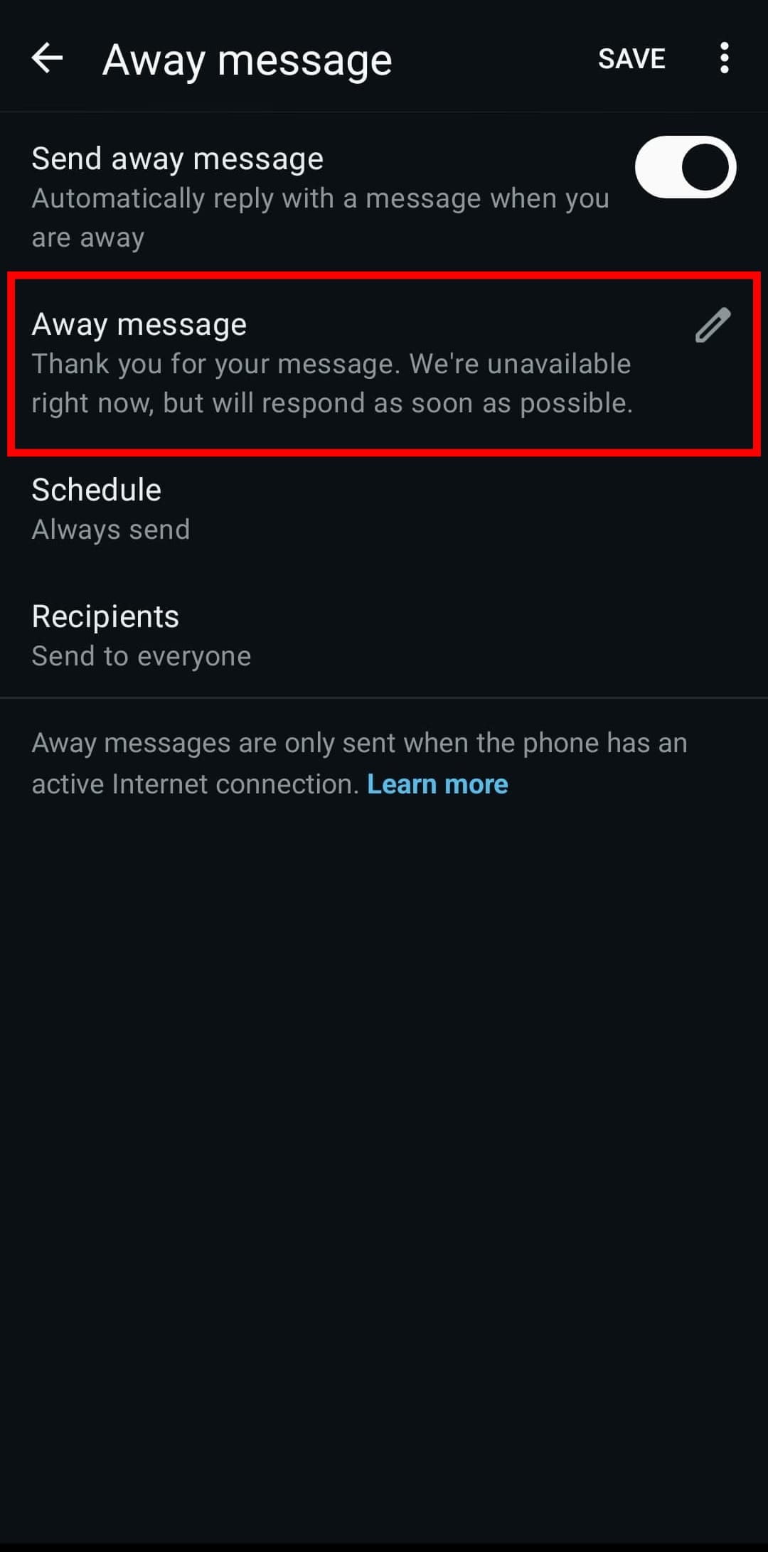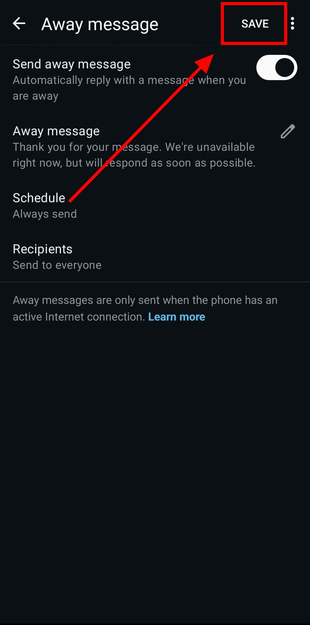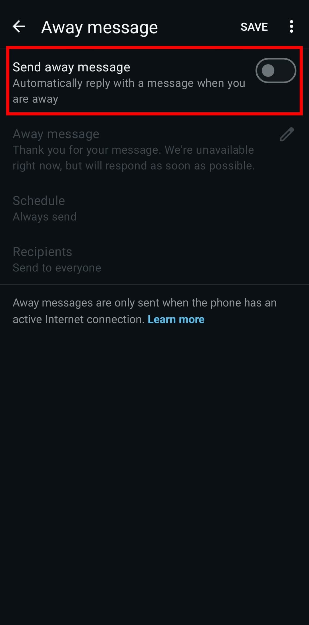 Step 3: Toggle on the ‘Send away message’ switch