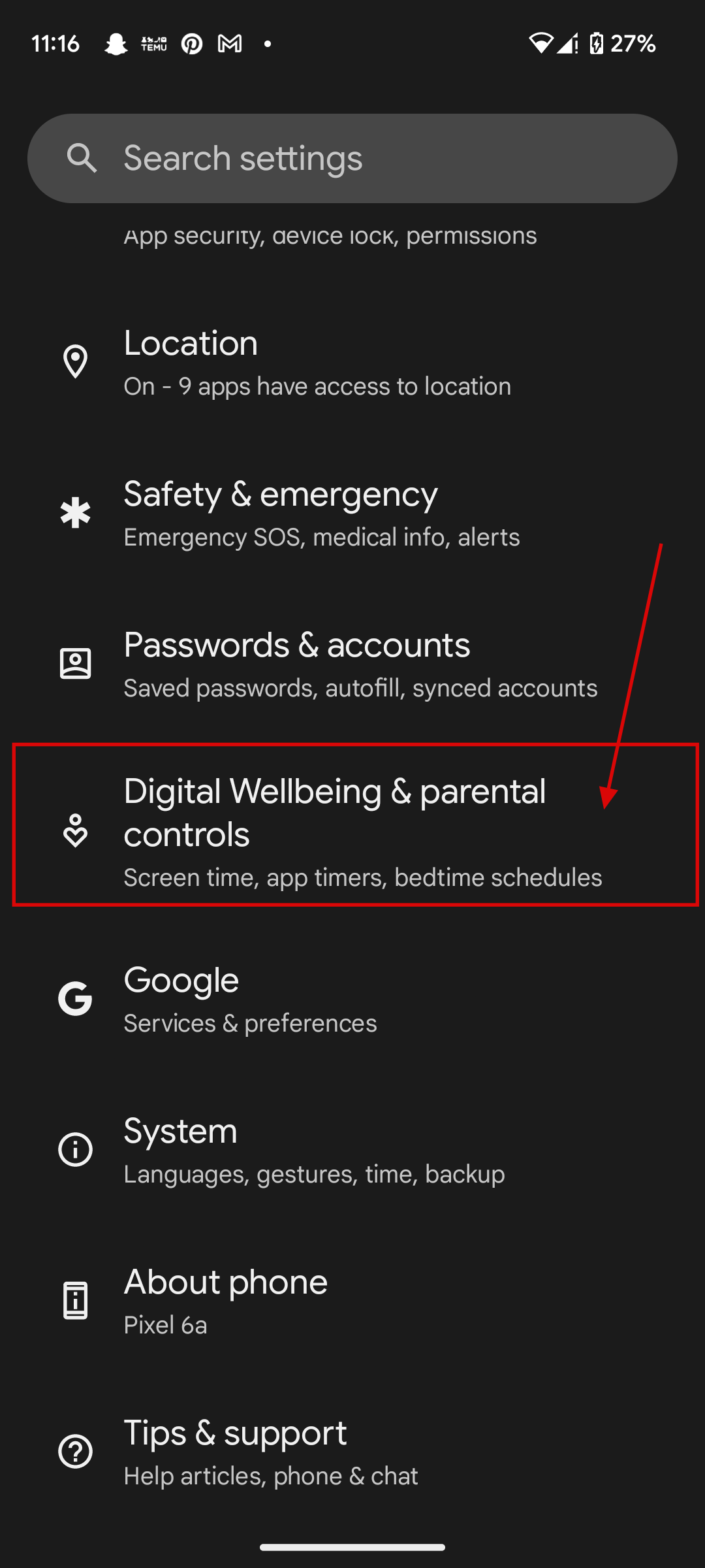 Step 2: Scroll down the Settings menu and tap on Digital Wellbeing & parental controls