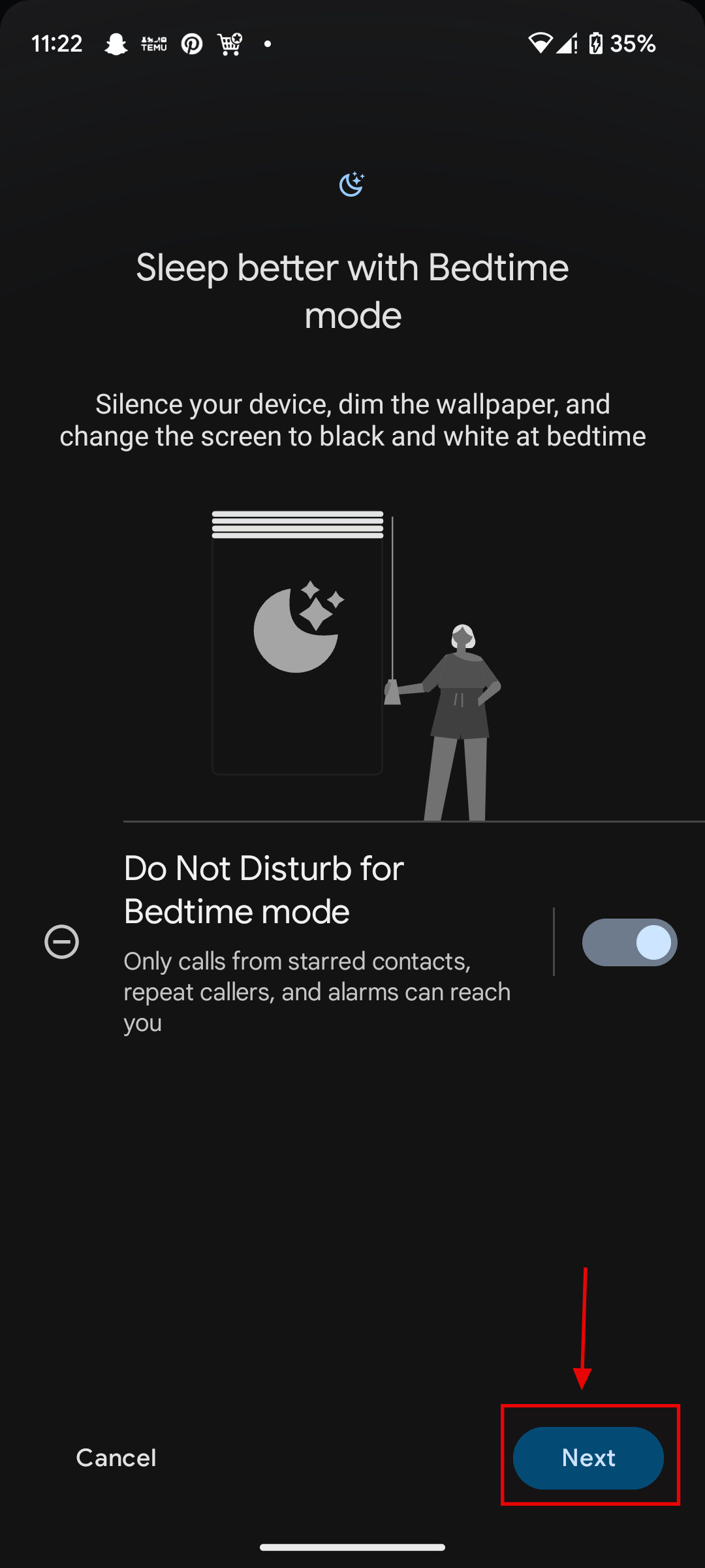Step 4: On the Bedtime mode screen, you'll likely see a Next button if it's your first time. Click on it