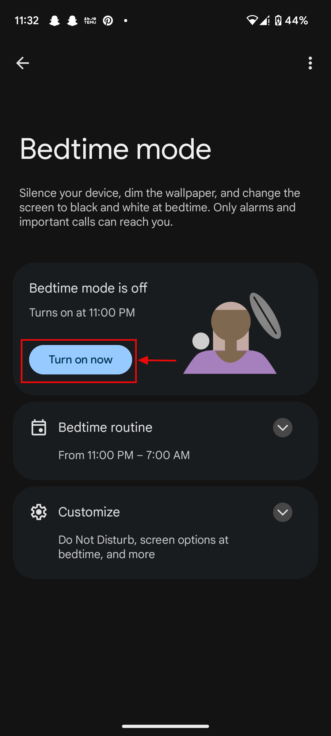 Step 6: Once you've configured your preferences, click on Turn on now to activate Bedtime mode