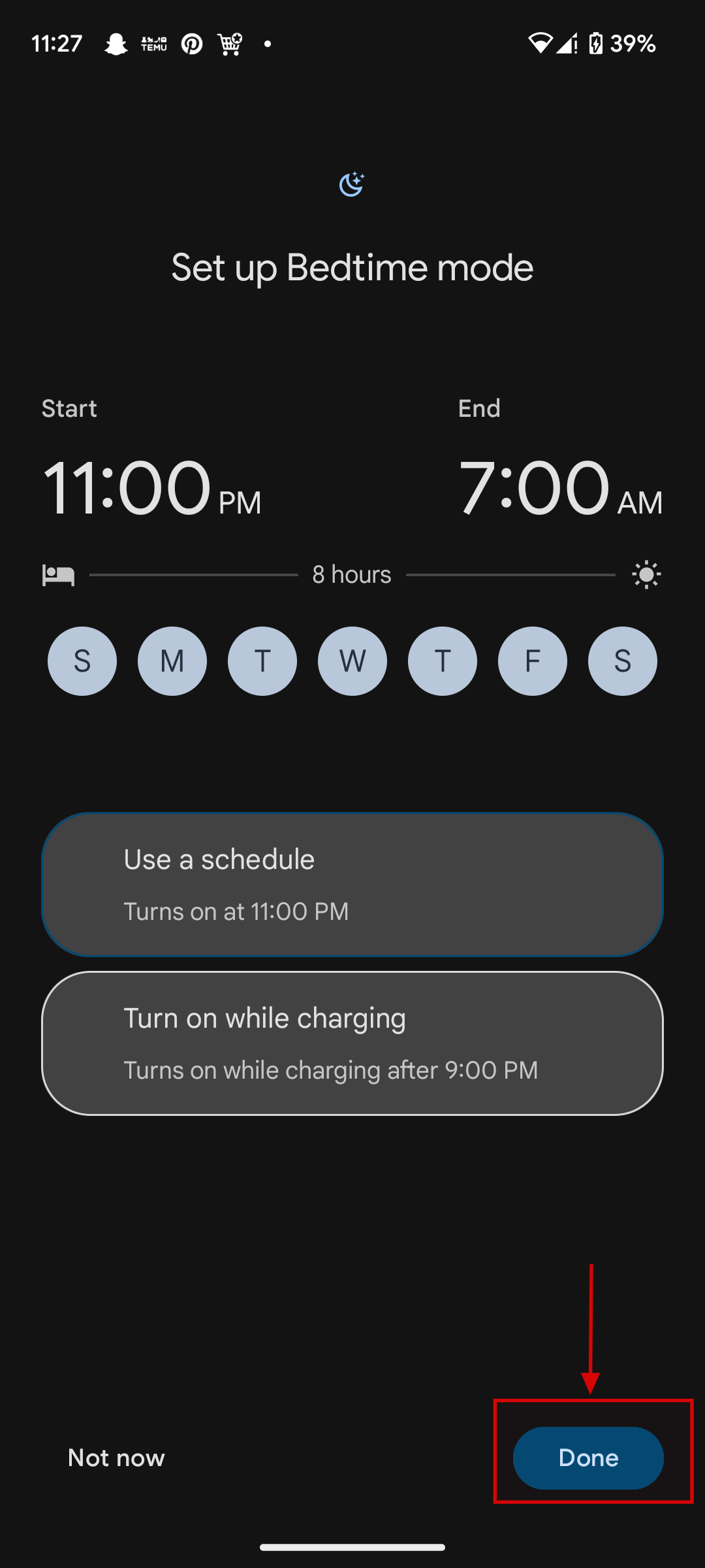 Step 5: You can set Bedtime Mode to activate on a fixed schedule (start time, end time, and days) or automatically when charging during your scheduled bedtime hours. Then Click on Done