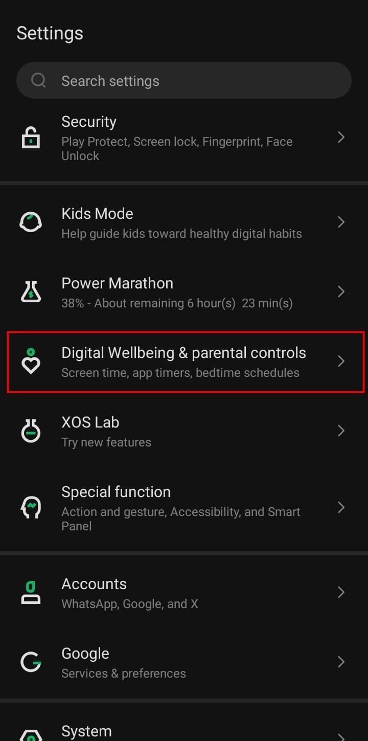- Open your phone's settings and select "Digital Wellbeing & parental controls"