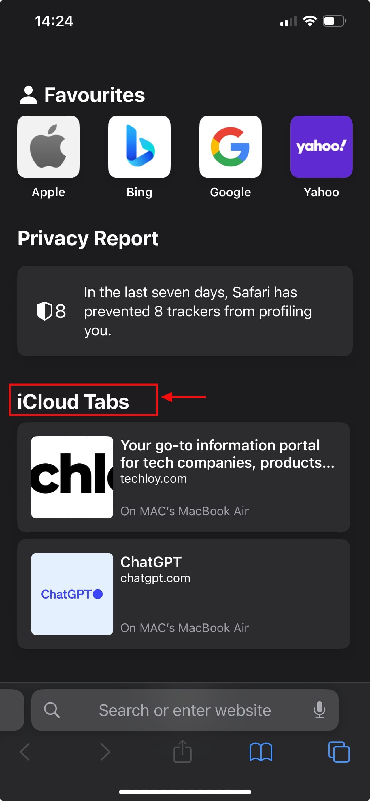 Step 3: Scroll past Favorites, Frequently Visited, Privacy Report, and Recently Closed Tabs, you'll see the name of your other devices and under will be your synchronised tabs with your other devices