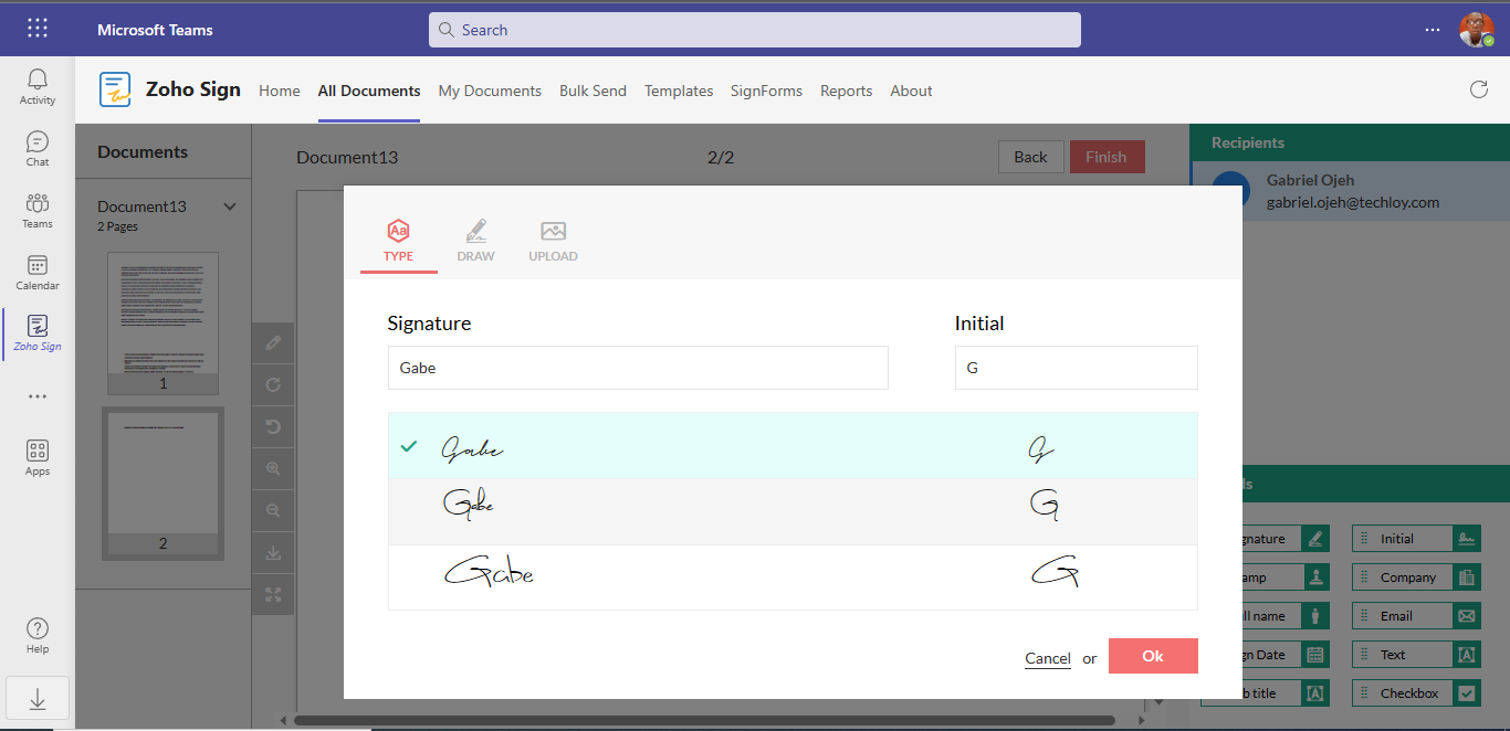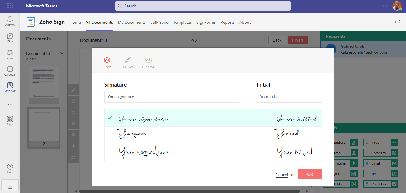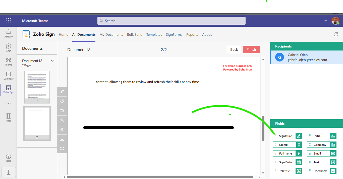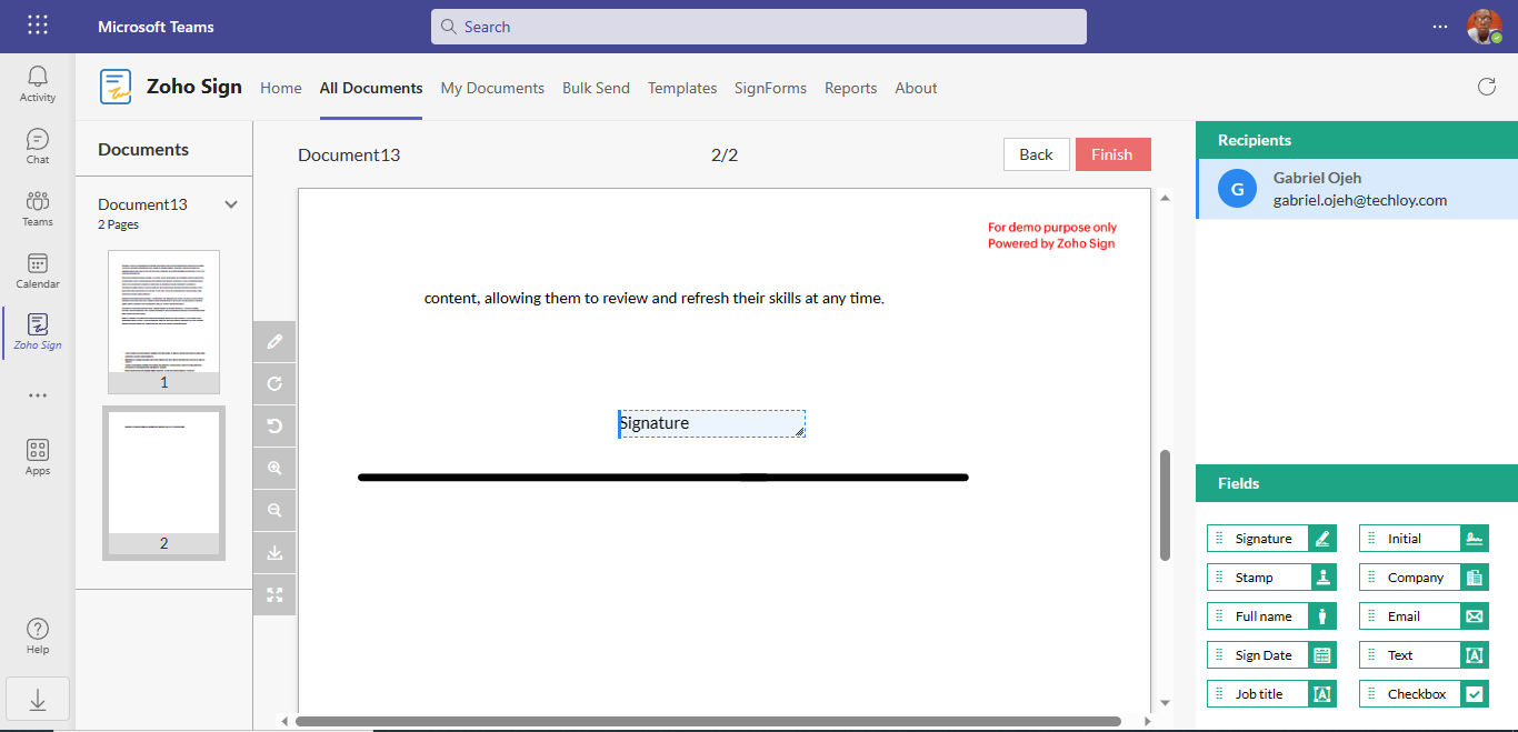 8. Next, Zoho will open the document within Microsoft Teams, offering you a range of editing options. These options include adding your signature, initials, company details, email, text, job title, and date. You can easily utilize these editing features by using the drag-and-drop functionality available in the sidebar.