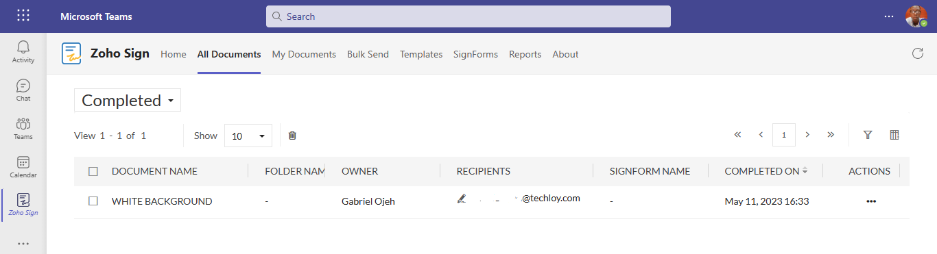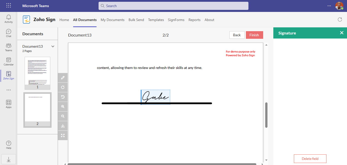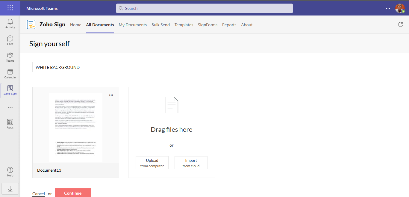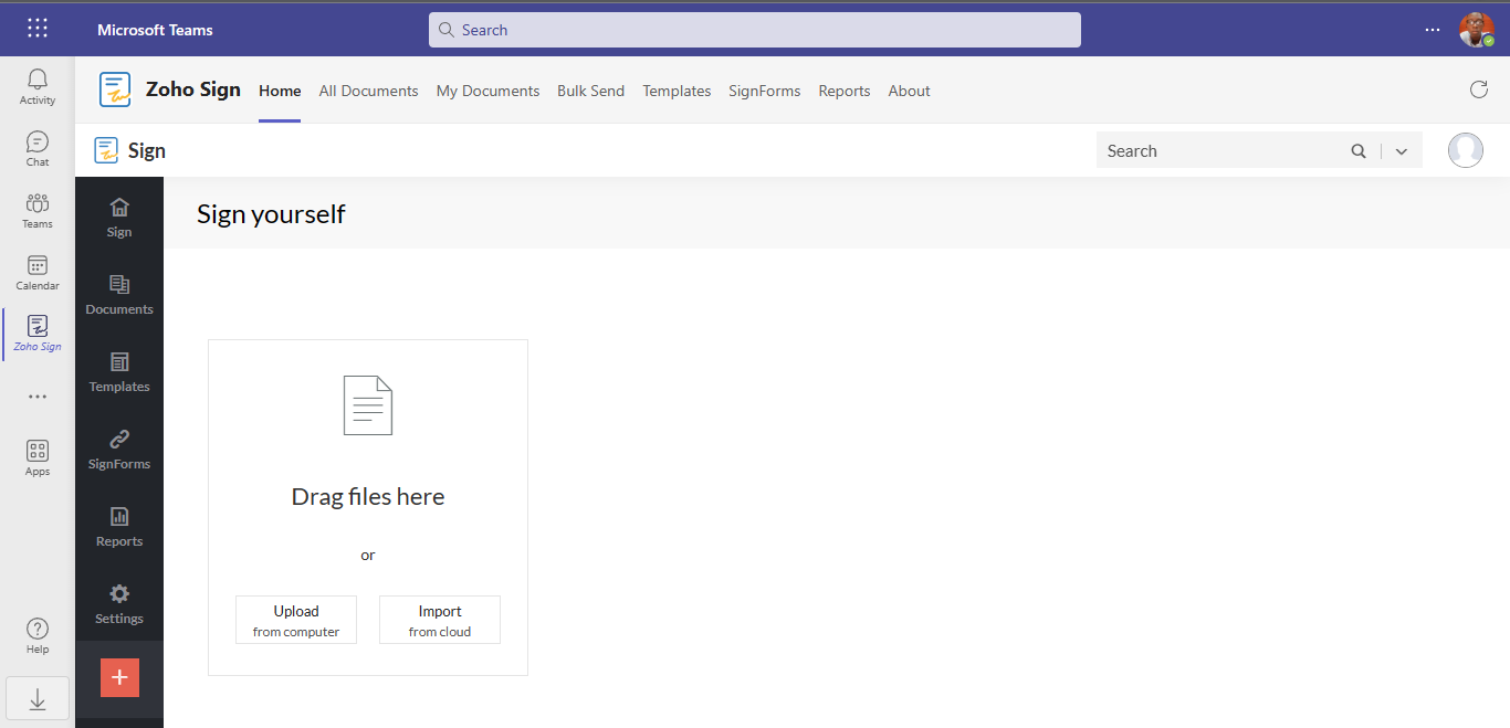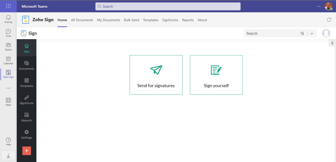 In this article, we would be going over how to sign documents in Microsoft Teams using Zoho Sign. To learn how to use SignEasy to sign documents in Microsoft Teams, see this article.