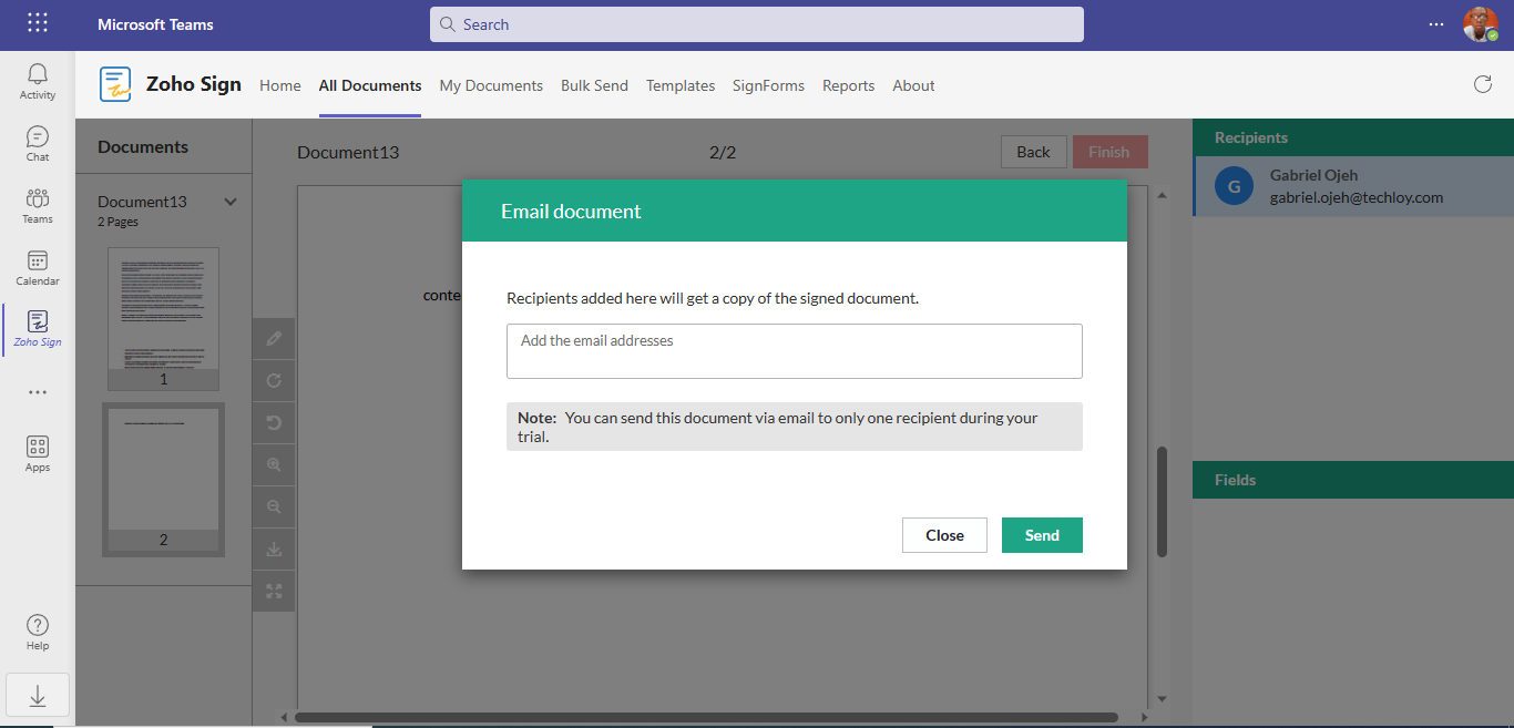 13. Once done, Click on finish and a pop-up would appear asking you to input the email of the recipient. If you are required to send the signed document via email, you can then input the recipient email, if not, click close.
